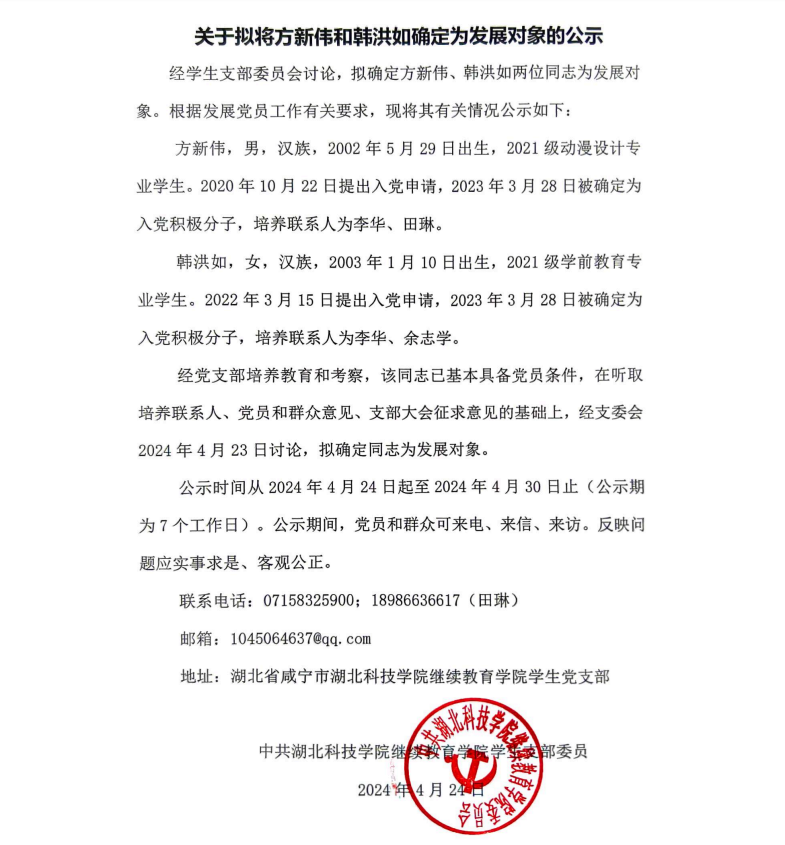 beat365官方网站学生支部关于拟将方新伟和韩洪如确定为发展对象的公示