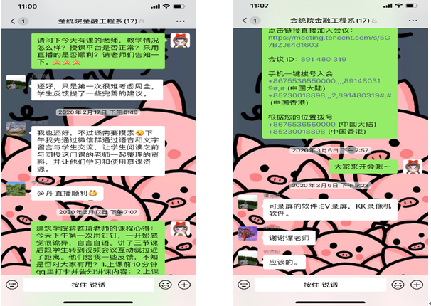 在开学之初,应用金融系主任马勇、副主任伍伟从三方面保障在线教学工作的顺利开展。首先,建立“2020春季学期应用系本科教学”微信群,作为专门的系本科教学管理群,通过该群及时下发各项教学通知,做到信息传导的纯净化、节奏化和贴身化,强化各位老师对在线教学的认知,及时反馈和解决教学过程中发现的问题,保证在线教学质量。其次,关心教师教学质量和教学效果。系副主任伍伟老师不断督促老师完善在线教学手段,落实在线教学方式、教学平台、教学辅助工具等。还通过与核心课程负责老师沟通,确定了核心课程的本科教学负责人,进一步明确落实了课程的教学组织责任。第三,关爱学生听课质量和身心健康。系主任组织任课老师清查课程的所有修课学生,做到在线教学不漏下任何一个学生,对未及时加入课程群的学生,通过教务办、辅导员的帮助联系到本人。在全院清查本科毕业论文写作情况时,发现系里有三名本科生寒假未带电脑回家,因疫情影响,毕业论文写作产生困难。在两位系主任的推动下,三位同学的困难都得到解决,学生感受到来自学院老师的关心与爱护。