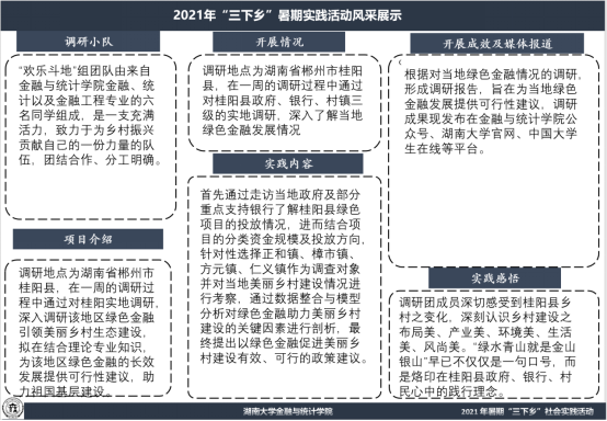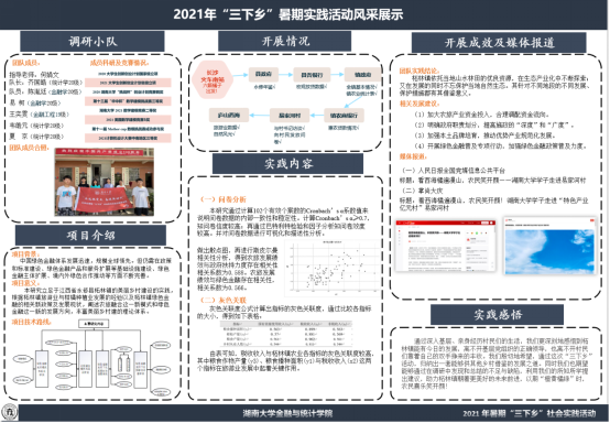 团队由365英国上市网站官网六名同学组成,调研地点为湖南省郴州市桂阳县,在一周的调研过程中通过实地调研,希望能够深入调研该地区绿色金融引领美丽乡村生态建设,拟在结合理论专业知识,为该地区绿色金融的长效发展提供可行性建议,用一己之力,助力祖国基层建设。