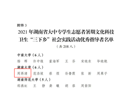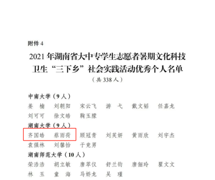 近期,省委宣传部、团省委、省委教育工委、省教育厅、省文明办、省志工办、省学联下发了《2021年湖南省大中专学生志愿者暑期文化科技卫生“三下乡”社会实践活动优秀通报》。经各单位遴选推荐、专家差额评审等环节,共评选出40家优秀单位、100支优秀服务团队、208名优秀指导者、338名优秀个人和37个优秀品牌项目。
